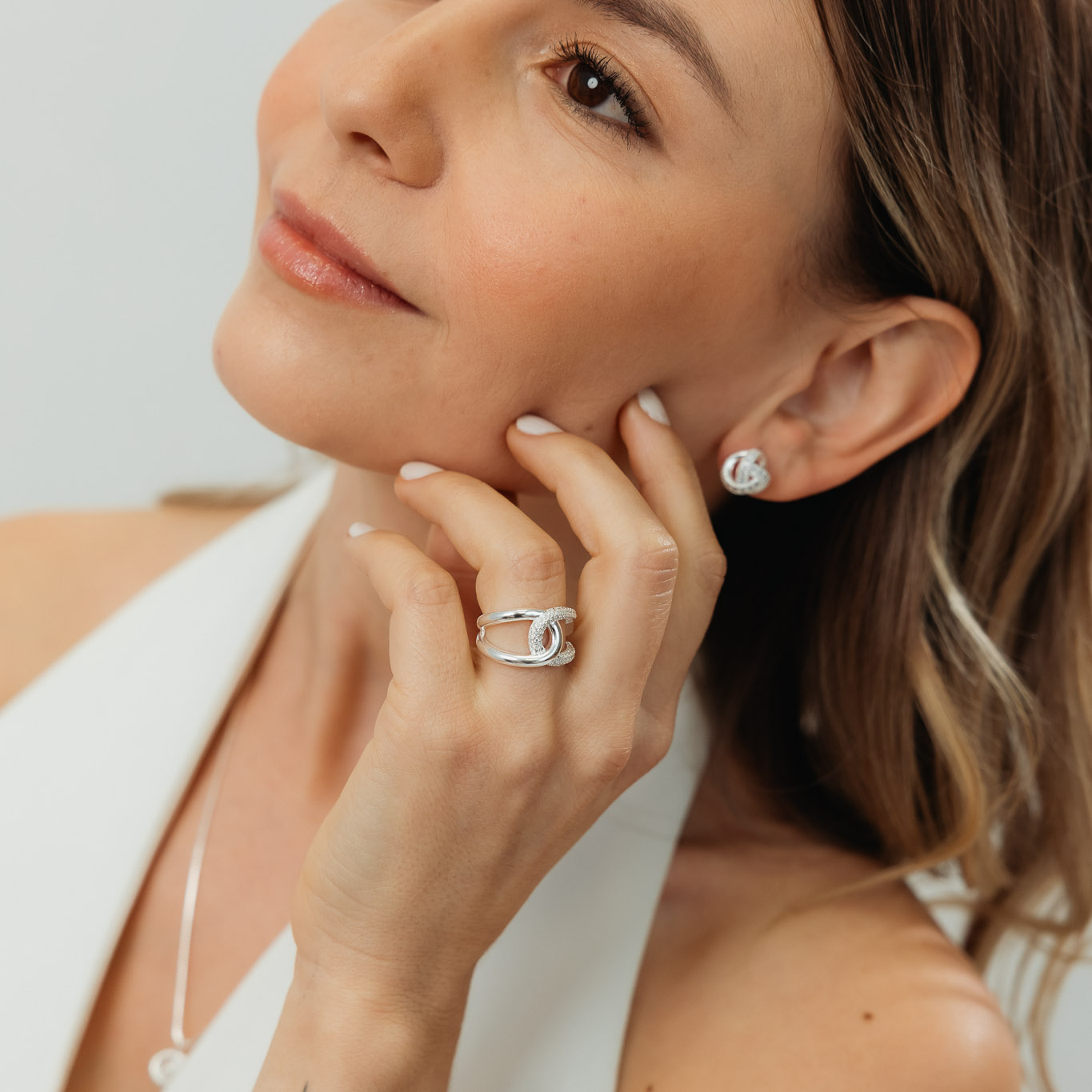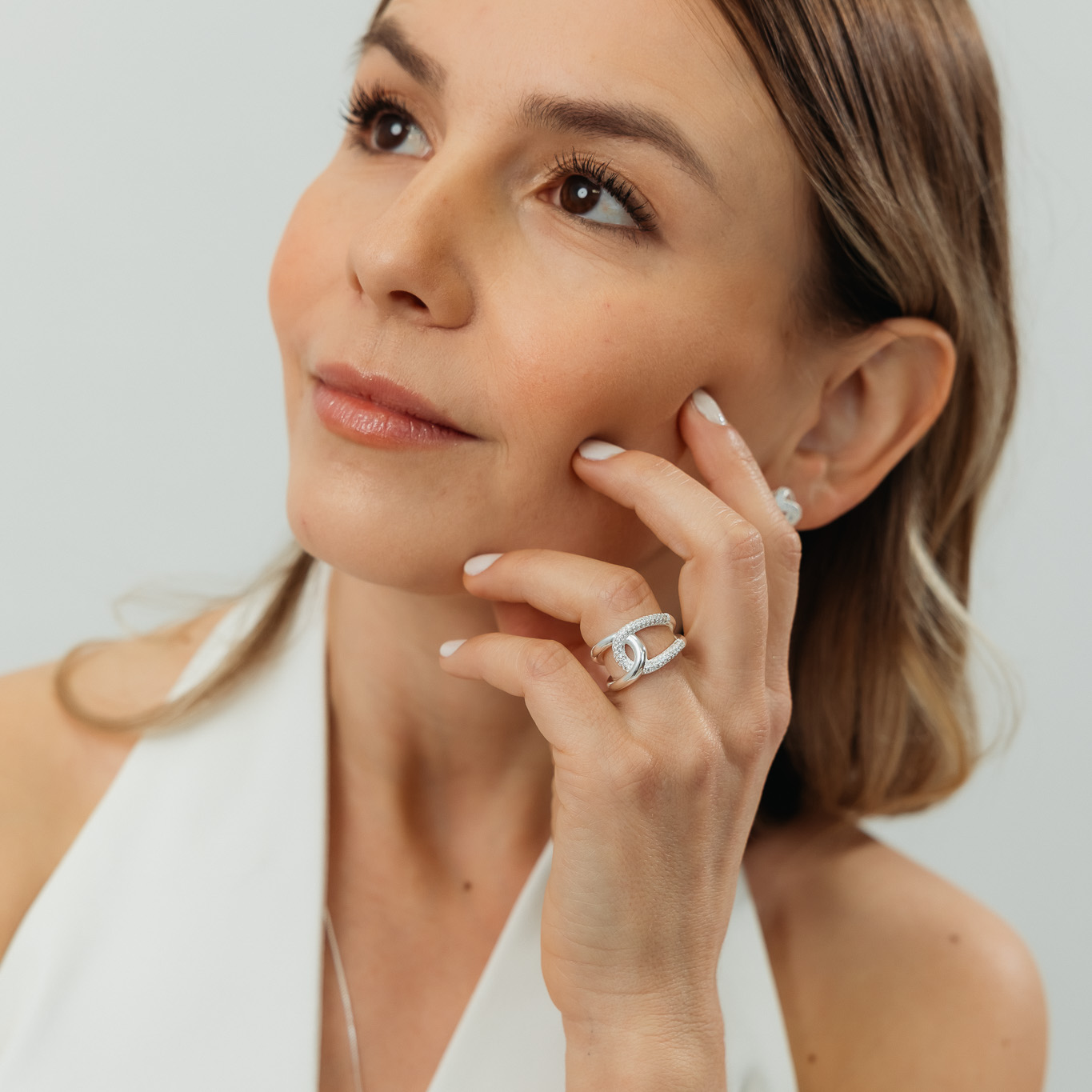 Anello elegante a forma di catena, impreziosito da cristalli scintillanti. Il design moderno e sofisticato dona luce e stile a qualsiasi look, rendendolo perfetto sia per l’uso quotidiano che per occasioni speciali. Un gioiello versatile e di grande impatto, ideale per chi ama dettagli brillanti e contemporanei.