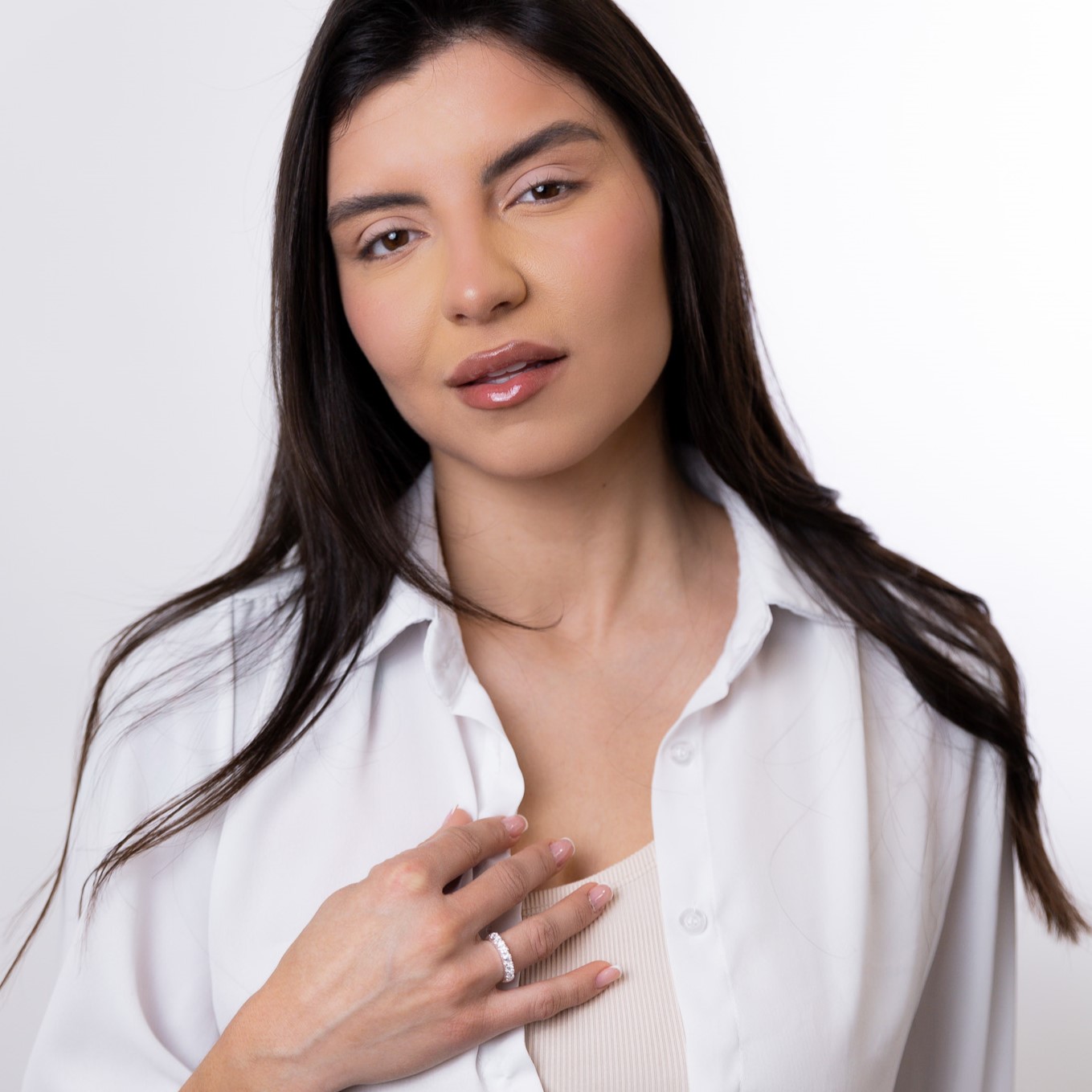 Anello fedina spessa con pietre dal design elegante e moderno. La fedina più larga, impreziosita da pietre scintillanti incastonate, cattura la luce e dona un tocco di brillantezza deciso al look. Perfetto da indossare da solo per un effetto importante o in abbinamento ad altri anelli per creare uno stile unico e sofisticato. Un gioiello versatile, ideale sia per l’uso quotidiano sia per occasioni speciali.