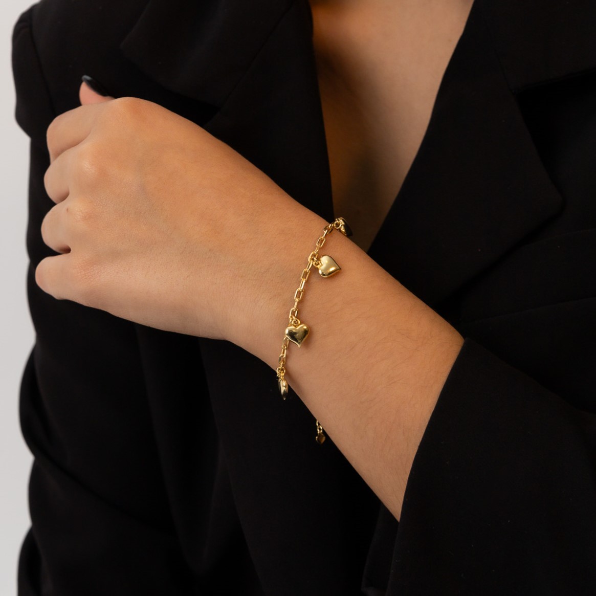Il Bracciale con 5 Cuori Pendenti si distingue per il suo design romantico e raffinato, impreziosito da cinque delicati cuori pendenti che si muovono con grazia al polso, creando un effetto luminoso e armonioso. Ogni dettaglio è curato con attenzione per esprimere eleganza, leggerezza e uno stile contemporaneo senza tempo. Perfetto per aggiungere un tocco di dolcezza e femminilità a qualsiasi outfit, questo bracciale è ideale sia per l’uso quotidiano che per occasioni speciali. Un gioiello versatile e ricco di significato, pensato per valorizzare ogni look con discreta raffinatezza.