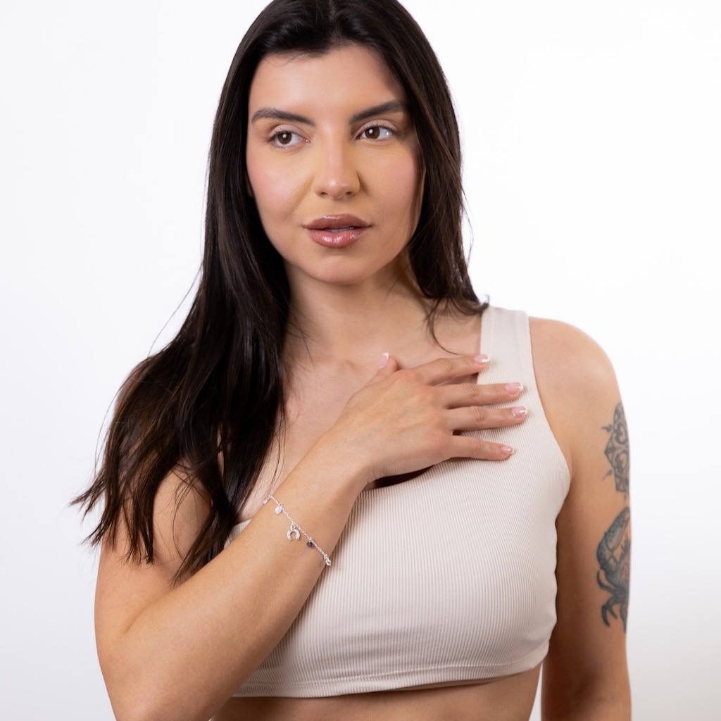Un gioiello ricercato e simbolico, il Bracciale Country si distingue per la sua maglia portoghese robusta e armoniosa, impreziosita da due zirconi luminosi, due delicati cuori e un piccolo ferro di cavallo pendente. La combinazione di dettagli brillanti e simbolici conferisce al bracciale un’eleganza contemporanea, con un tocco originale e distintivo. Perfetto per chi ama uno stile country-chic moderno, può essere indossato da solo per un look elegante o abbinato ad altri bracciali per un effetto stratificato, aggiungendo fascino e personalità a ogni outfit.