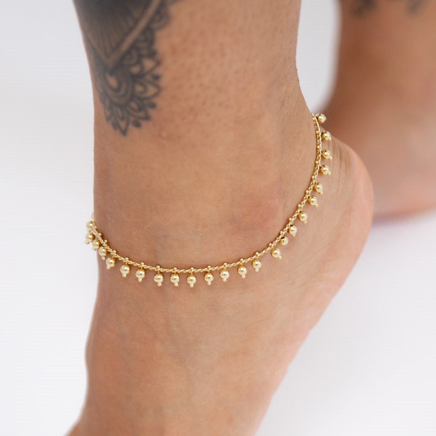 Elegante e delicata, questa cavigliera è impreziosita da piccole sfere pendenti che donano movimento e luminosità ad ogni passo. Perfetta da indossare da sola per un look raffinato o abbinata ad altri gioielli per uno stile più personale, è realizzata con materiali leggeri e confortevoli. Un accessorio versatile e senza tempo, ideale per valorizzare outfit quotidiani o occasioni speciali.
