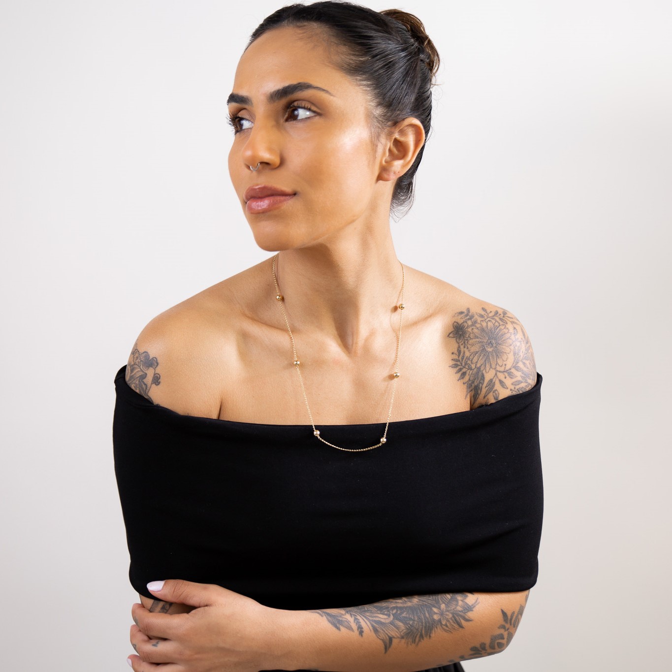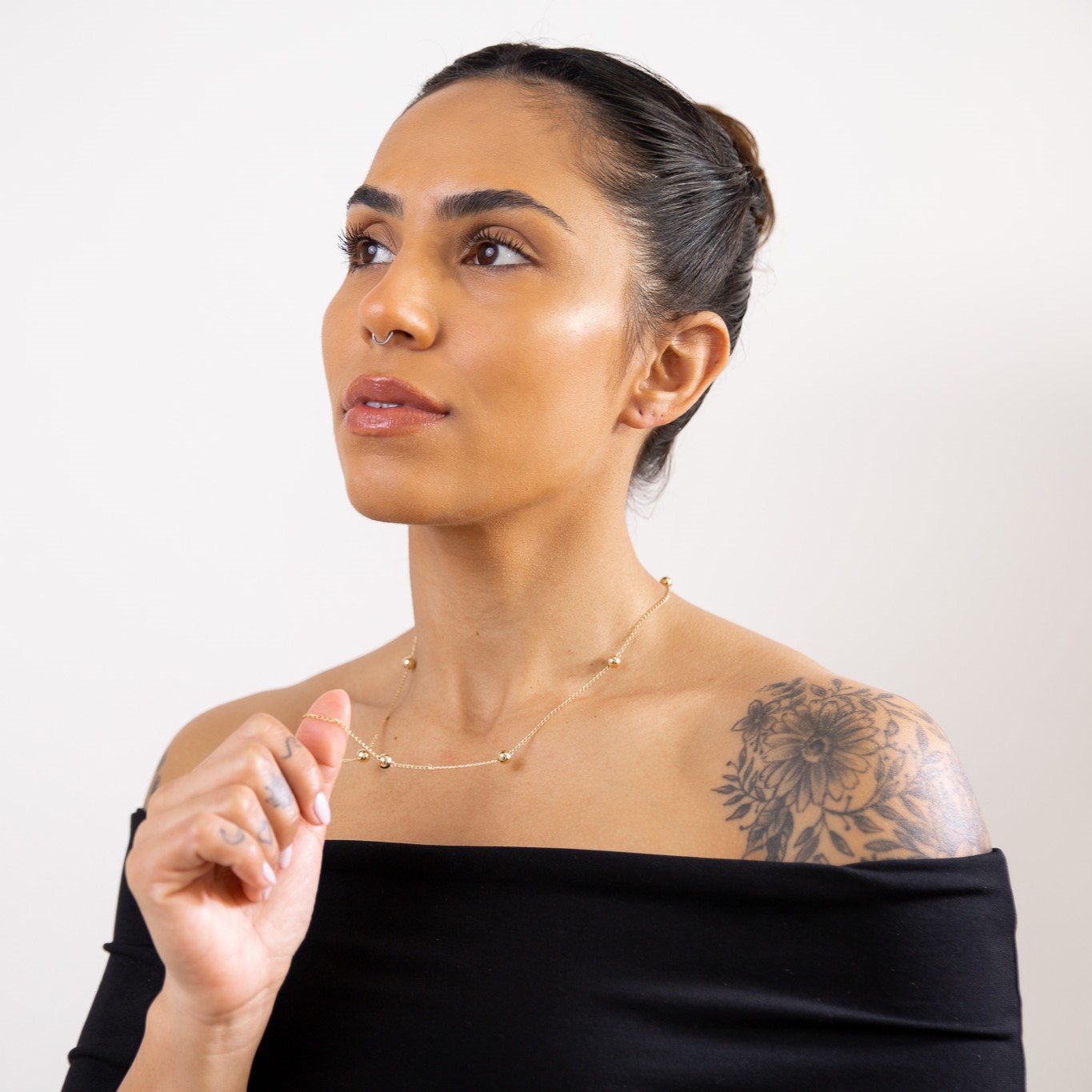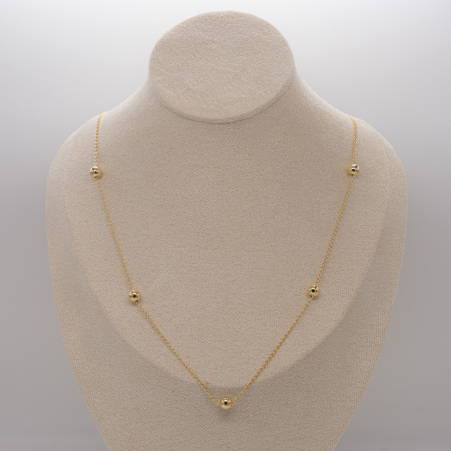 Collana a catena con palline lisce, elegante e raffinata, perfetta per chi ama accessori minimalisti ma di carattere. Le palline lisce lungo la catena creano un effetto armonioso e luminoso, rendendo la collana ideale da indossare da sola o abbinata ad altri gioielli. Un accessorio versatile e senza tempo, adatto sia all’uso quotidiano che a occasioni specia