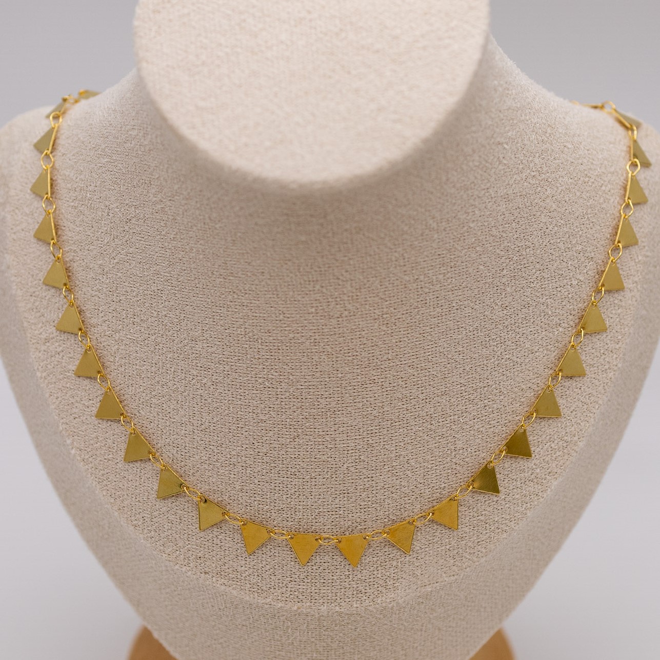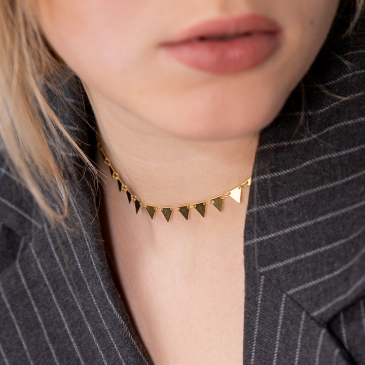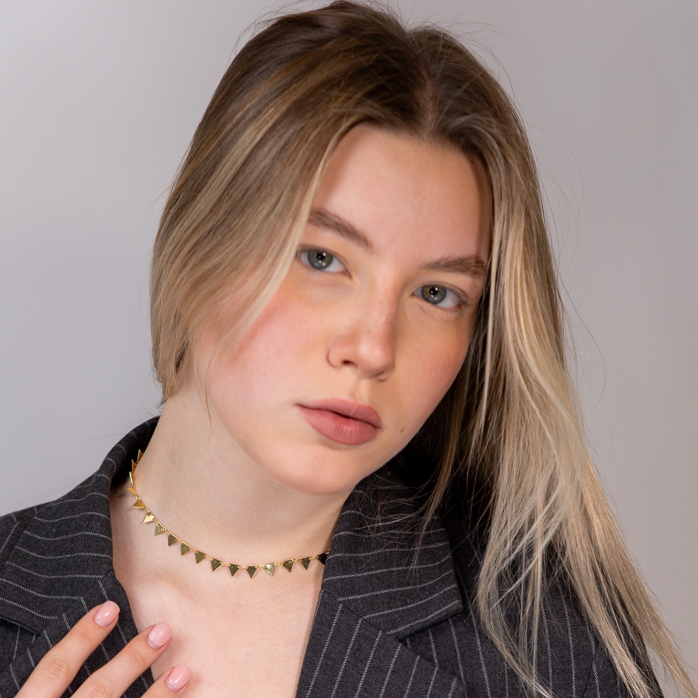 La Collana Choker a Triangoli è un’opzione di tendenza e geometrica. Caratterizzata da piccoli triangoli disposti lungo la choker, questa collana aggiunge un tocco moderno e audace al tuo collo. Leggera e versatile, è perfetta per un look contemporaneo e alla moda, offrendo un’opzione elegante per arricchire la tua collezione di gioielli. Un accessorio che si fa notare per il suo design unico e raffinato.