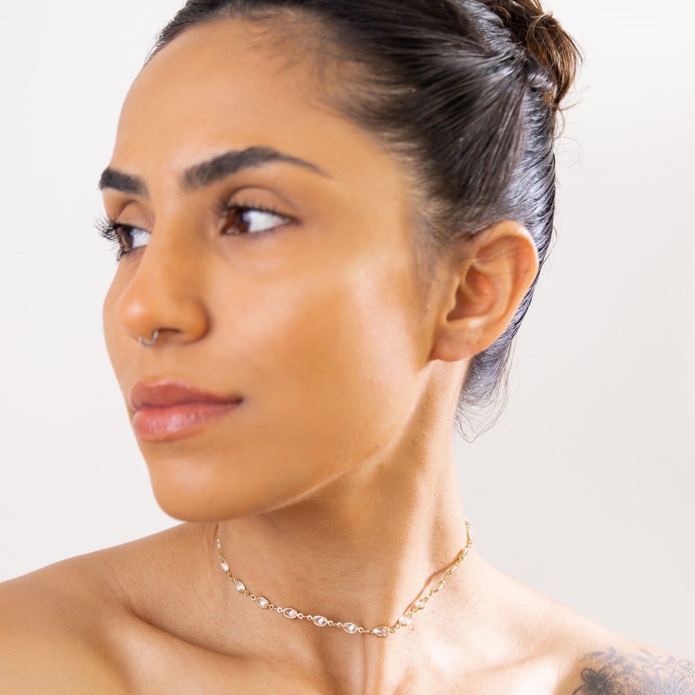 Collana choker con punti luce ovali dal design elegante e moderno. I dettagli luminosi a forma ovale catturano la luce e donano un tocco di brillantezza al tuo look, rendendo questo gioiello perfetto per outfit quotidiani o per occasioni speciali. Leggera e versatile, si adatta con semplicità a diversi stili, aggiungendo un tocco di raffinatezza e femminilità.