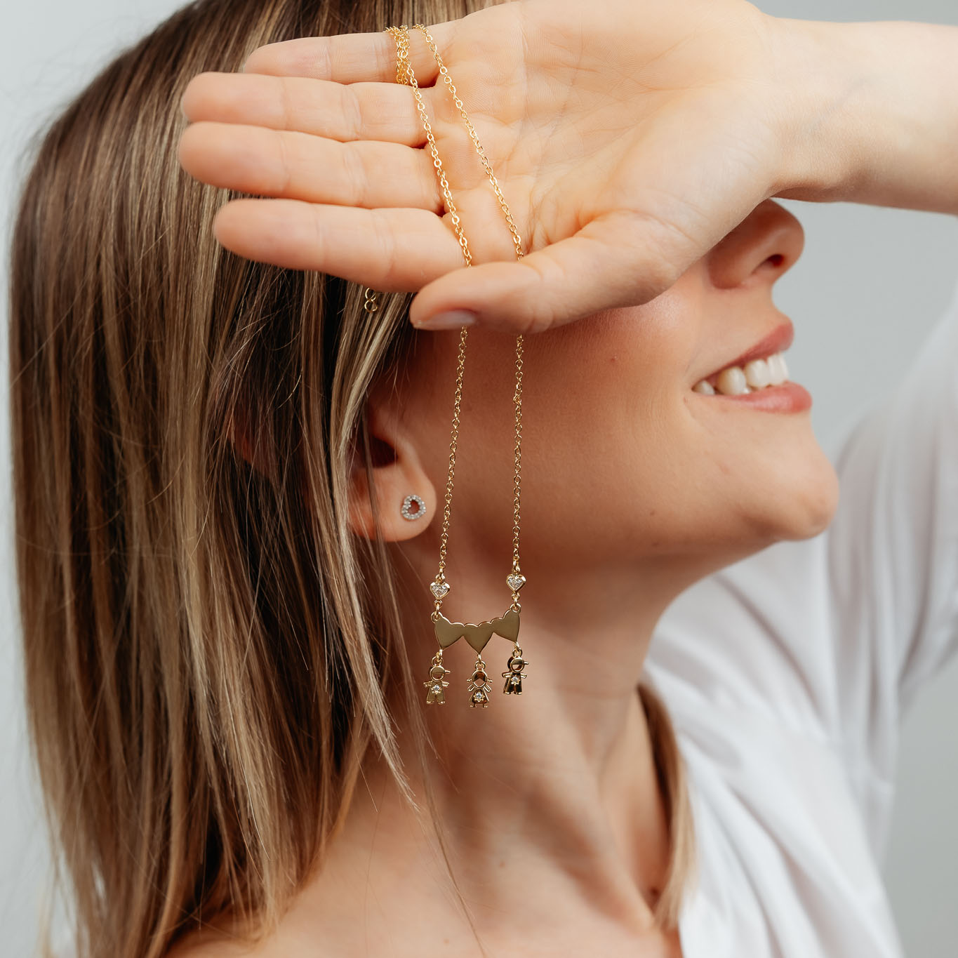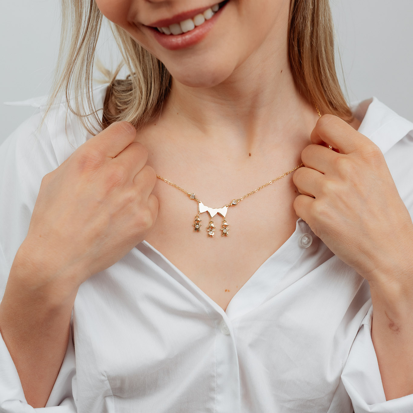 COLLANA DUE FIGLI E UNA FIGLIA CON TRE CUORI LISCI E UN PUNTO LUCE
